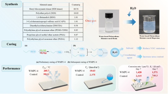 据悉,该论文聚焦于水性聚氨酯潮固化树脂的创新性研究。针对行业内单一改性难以有效增强树脂亲水性这一痛点问题,创新性地提出“一锅法”合成新方案,即采用水同时作为稀释剂和交联剂,构建高效且环保的制备路径。