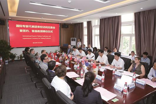 图为:国际专家代表团来武汉工程大学访问见面会暨签约、客座教授聘任仪式