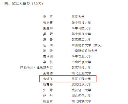近日,从湖北省教育厅获悉,湖北省第八届“长江学子”大学生就业创业人物事迹征集活动评选结果揭晓,武汉工程大学资源与安全工程学院矿物加工工程专业学生宋灿飞入选应征入伍类大学生就业创业人物。