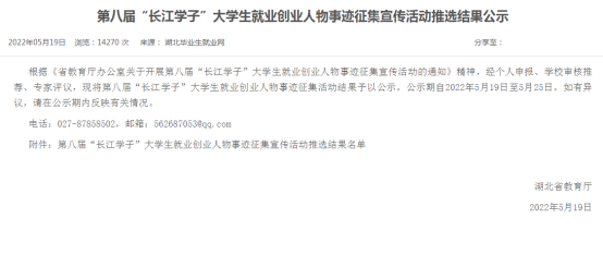 第八届“长江学子”大学生就业创业人物评选活动由省教育厅主办,设开拓创新、自主创业、基层就业、参军入伍、自强奋进5个类别,共150名大学生就业创业人物典型入选。活动旨在落实立德树人根本任务,加强高校毕业生就业创业宣传,展示湖北高等教育人才培养成果,发挥先进典型示范引领作用。