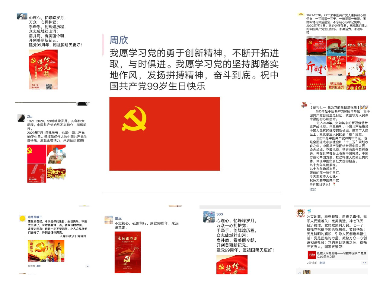 2020年7月1日是中国共产党成立99周年纪念日,suncitygroup太阳集团资源与安全工程学院全体学生党员开展了以“我为党的生日送祝福”为主题活动。活动共征集来自基层党支部、入党积极分子的微信朋友圈和手写祝福短语等形式作品178篇。