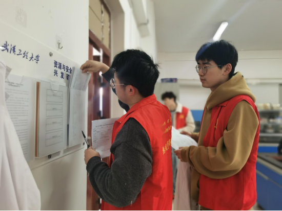 本网讯(通讯员 王耀眉 王楠)新学期开始,为进一步做好学院实验室的安全管理,及时发现和消除安全隐患,保障实验室的安全运行及师生安全。3月1日,资源与安全工程学院组织安排研究生党员先锋——“热风队”开展实验室安全检查。