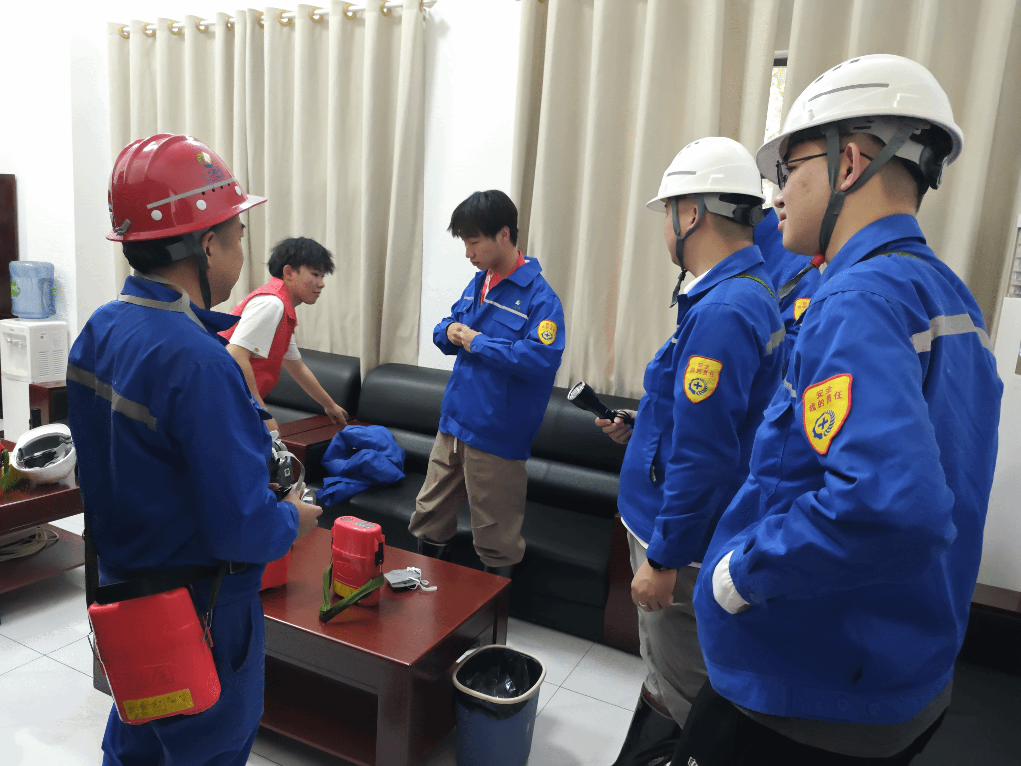 下井前,实践团接受严苛的安全培训。安全员详解自救器使用、井下行走规范与应急避险知识,“井下步步有风险,每步须循规程”的叮嘱,让同学们绷紧安全之弦。戴好防尘口罩、换上厚重矿工服、扣紧安全帽、系牢自救器,装备齐整的刹那,众人恍若化身为真正的矿工,对即将开启的地心之旅满怀期待。