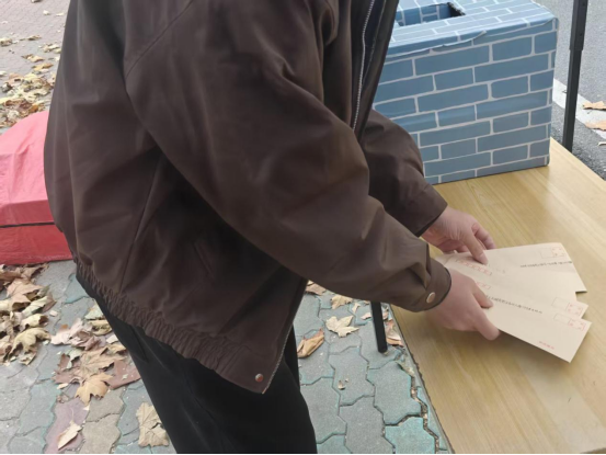 在为期六天的活动中,同学们将写好的信件投入设置在摆点处、宿舍楼与教学楼的信箱中。学术调研部成员每日迎着晨光暮色,定时穿梭于校园各处,细心开箱、收集、清点并整理每一封信件,确保这些承载着思绪与期许的书信都能被妥善保管或如期寄出,不负每一份真挚的托付。一位参与同学表示:“这次活动让我有机会静下心来,给未来的自己写一封信,感觉很特别,也很有意义。”