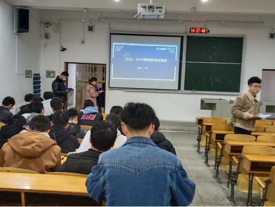 丁航老师生动幽默的自我介绍后便切入主题,向同学们提出“为什么考研”这一问题,引起同学们的思考和讨论。在明确自己的考研动机后,丁老师从考研现状、院校专业、地区的选择、定位自己、安排考研复习进度等四个方面进行了详细的分析。