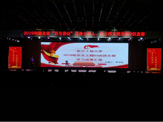 本次比赛在主持人的宣布下拉开了序幕,来自武汉市各个高校的团支部依次上台,以PPT展示和现场讲解的形式分别介绍了自己的支部概况,支部“学习”成果,支部荣誉等,然后又以才艺表演的形式展示了自己的支部风采。其中我院2018级安全工程三班团支部由团支书以PPT的形式从三个方面介绍了团支部。