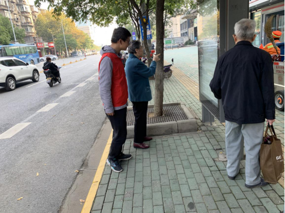 18日早上,志愿服务队第一小队即开始向目的地——虎泉街楚韵路公交站进发。志愿者们身着鲜艳的志愿队服,挺立在公交站台,尽心疏通四方乘客,同时为初来乍到的游客指明道路,为下车的老人接递行李,尽力为武汉的交通分忧解难。