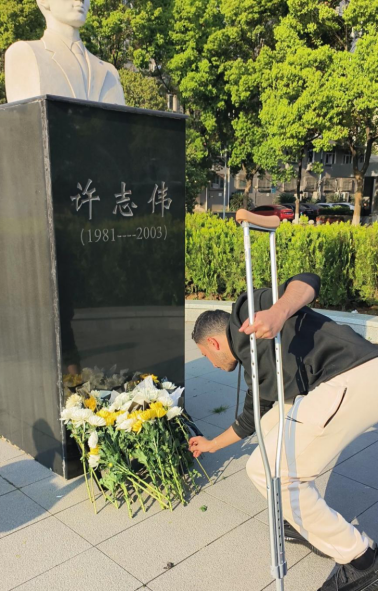 中外学子登上纪念碑基座,依次敬献鲜花并瞻仰许志伟雕像。