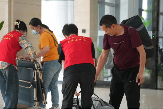 在指导老师的带领下,学生志愿服务队于早上8点到达训练营,参训营员们也陆续来到康复中心,志愿者们主动、热情地帮助营员家属搬运行李,办理入营手续,协助教练员对营员进行入营体能测评和心理评估。