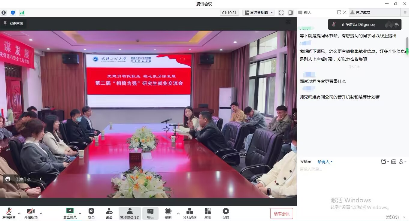 在交流互动环节,现场及线上参会的同学踊跃提问,提出“招聘信息繁杂如何筛选”、“如何平衡毕业季论文和求职压力”、“在读期间哪些经验积累比较重要”等有关就业的困惑,学院领导、导师及师兄师姐纷纷从不同角度悉心解答,讨论气氛热烈。