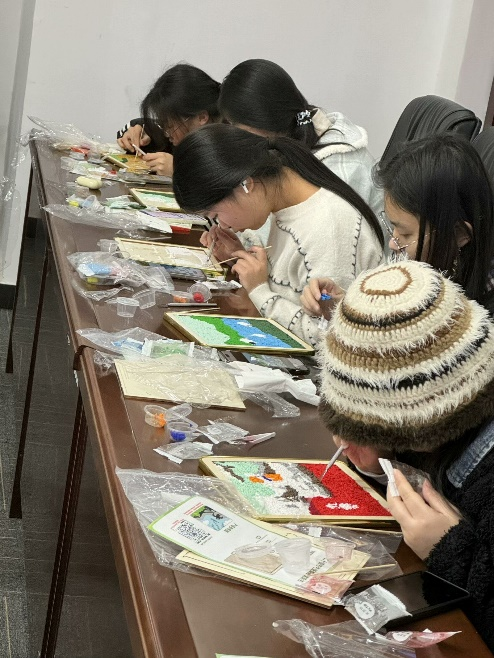 随后,进入手工制作环节,此次特别准备了玻璃灯画、马赛克杯垫以及非遗纸浆画三项内容供同学们选择体验。每一种手工制品都蕴含着深厚的文化底蕴,参与者们分组合作,用心地将材料组合成一幅幅精美的作品,每一笔、每一划都倾注了他们对传统文化的热爱与敬意。