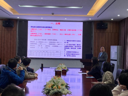 学院罗惠华教授根据学校相关规定,结合自身的工作经验,详细介绍了命题、审题、阅卷、成绩分析报告、考核材料归档等方面的操作细则。罗教授强调,试卷命题要充分体现考试的目的,应符合课程教学大纲的主要内容,题型结构合理,百分制下试题的难度系数应该控制好,命题覆盖范围要充分体现考试的目的。试卷阅卷需规范化,注意小题得分与大题得分以“+”分形形式相加,前后一致,且有阅卷人签名。此外,为保障试卷印制质量,试卷需使用学校统一模版,排版应符合学校统一要求。如命题教师出题应在模板框定的范围内,文字不可超出框外,使用统一的字体及行距等。命题完成后,应由各教研室主任严格审查并签名,确保试题质量。